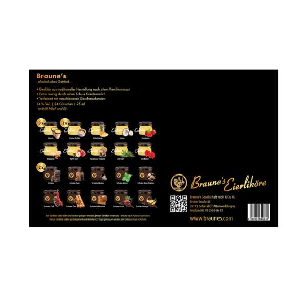 Hinter 24 Türchen verbergen sich verschiedene Eierlikör - Spezialitäten der Firma Braune`s. Dieser liebevoll gestaltete Adventskalender verkürzt die Wartezeit bis Weihnachten mit 24 mal köstlich cremigen Genuss. Ideal als Geschenk oder für die eigene Familie in der Vorweihnachtszeit