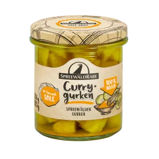 Schälgurken, Zucker, Wasser, Branntweinessig, Sole-Thermalwasser*, Salz, Curry-Gewürzmischung (1%) (aus der Sole-Thermalquelle Burg im Spreewald)