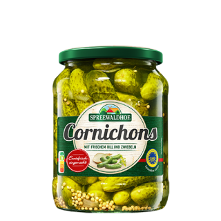 Besonders klein, knackig und sehr lecker: Cornichons werden handverlesen und mit frischem Dill und Zwiebeln zu einer Spreewälder Spezialität. Die kleinen Multi- Talente werten jedes Gericht auf und passen besonders gut zu einer herzhaften Brotzeit oder einem Party-Büffett.